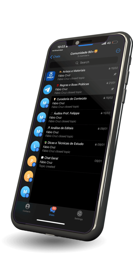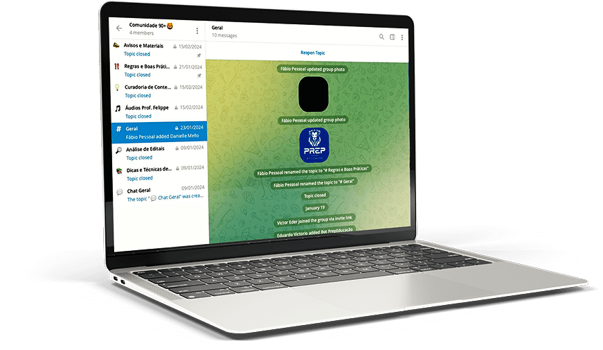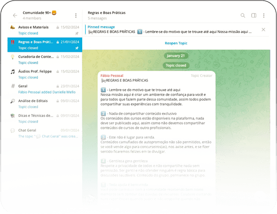 A Comunidade 90+ é um grupo exclusivo no Telegram focado em ajudar concurseiros a superar os desafios dos estudos para concursos públicos. Oferecemos análise de editais, dicas de estudo, mentorias sobre mentalidade de concurseiro, curadorias de livros e filmes, além de um chat para troca de experiências entre os membros.